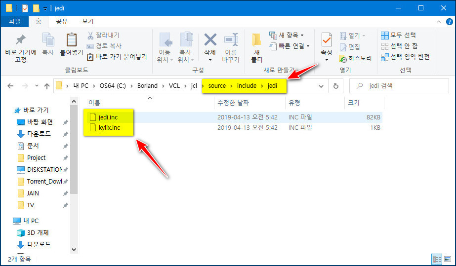 "jedi-master.zip" zip파일의 "jedi.inc"파일과 "kylix.inc"파일을 설치하려는 jcl의 "source\include\jedi"폴더에 덮어쓰기합니다.